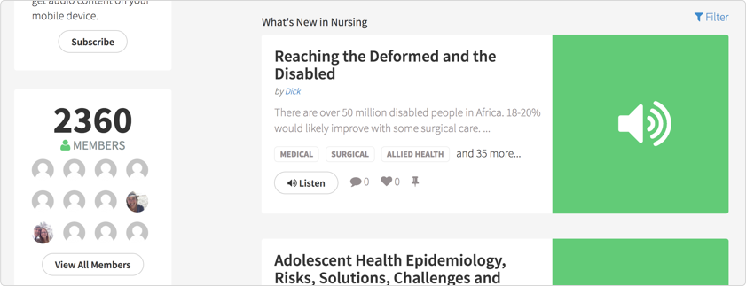 Similar to the unique Medical Specialty pages, we also created unique learning opportunities around the many Global Health Issues that exist today, complete with audio sessions, experts and stories.